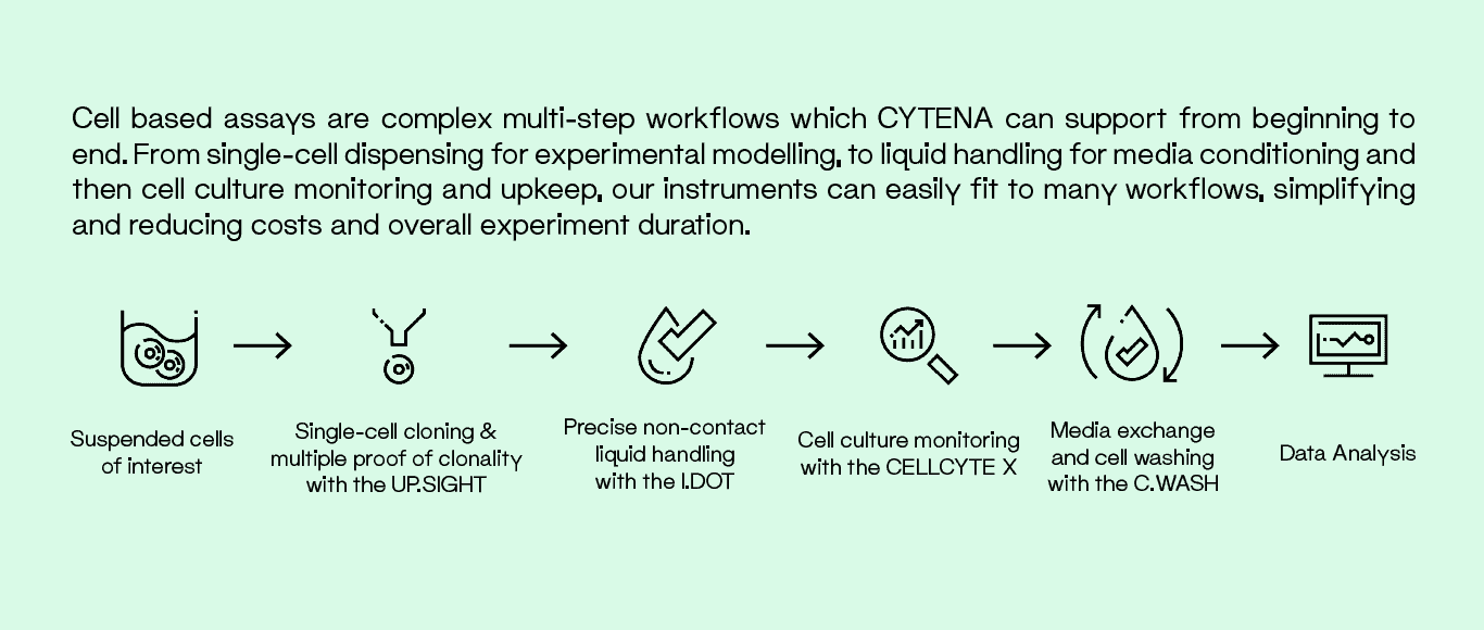 CYTENA has created a whole line of imaging, dispensing and liquid handling instruments— including the UP.SIGHT, CELLCYTE X, C.WASH and I.DOT—that automate and accelerate cell-based assay workflows.