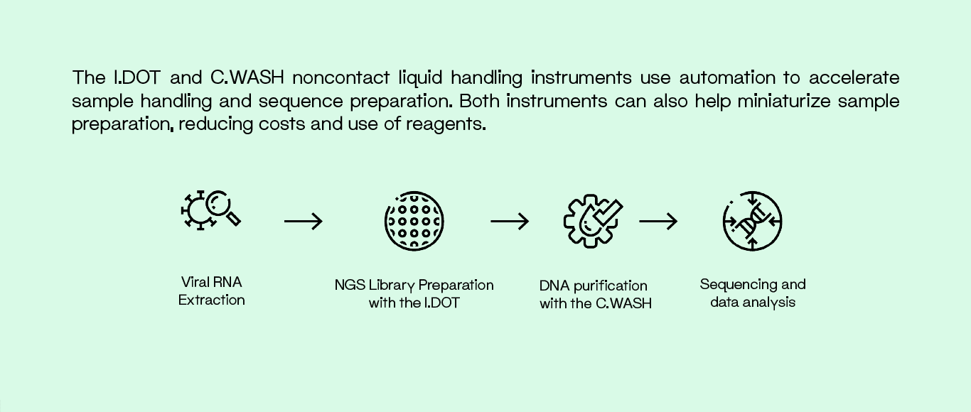 In order to keep track of new cases and variants, different sample preparation methodologies for next-generation sequencing have been explored, including miniaturization and a combination of different reagents. CYTENA’s I.DOT and C.WASH use noncontact dispensing technology to accelerate liquid handling and sample preparation. Particularly, the C.WASH uses centrifugal force to wash plates, reducing the amount of hands-on time and resources needed to purify COVID samples. Together, these two instruments are optimizing next-generation sequencing to keep up with the demands of this evolving public health emergency.